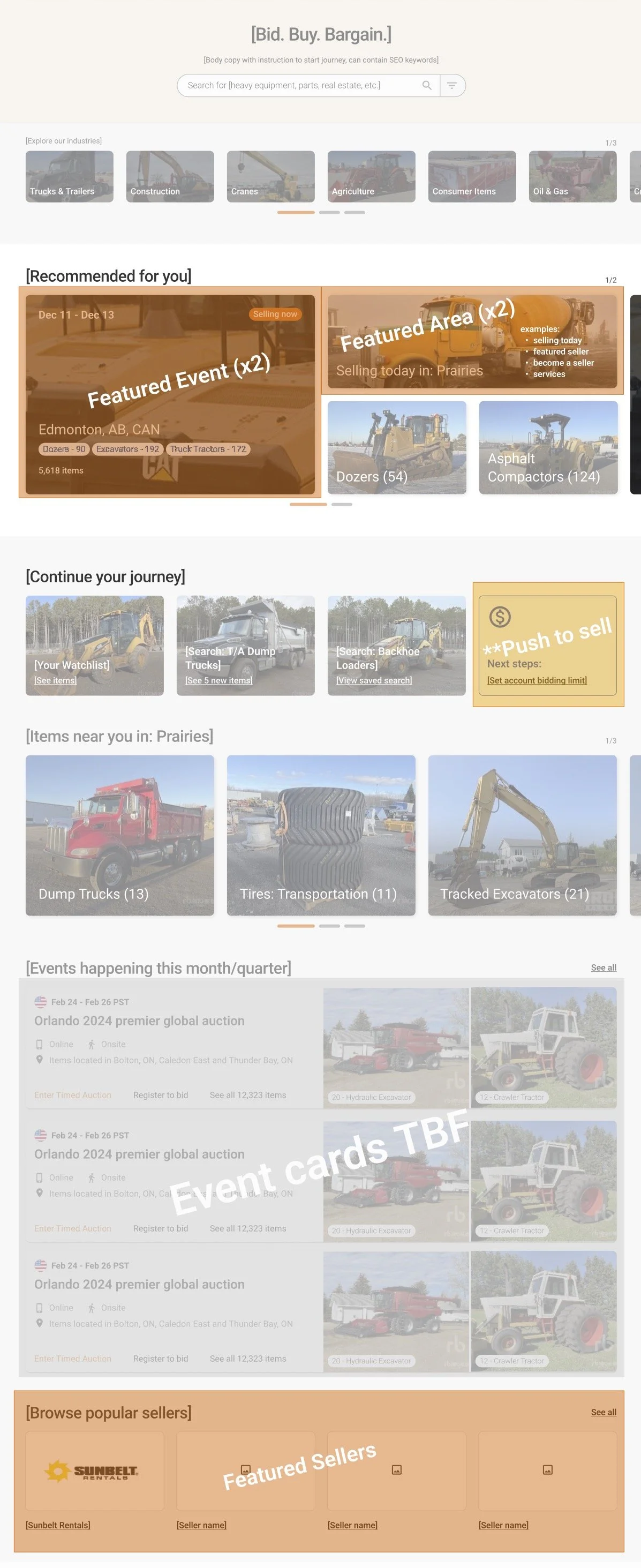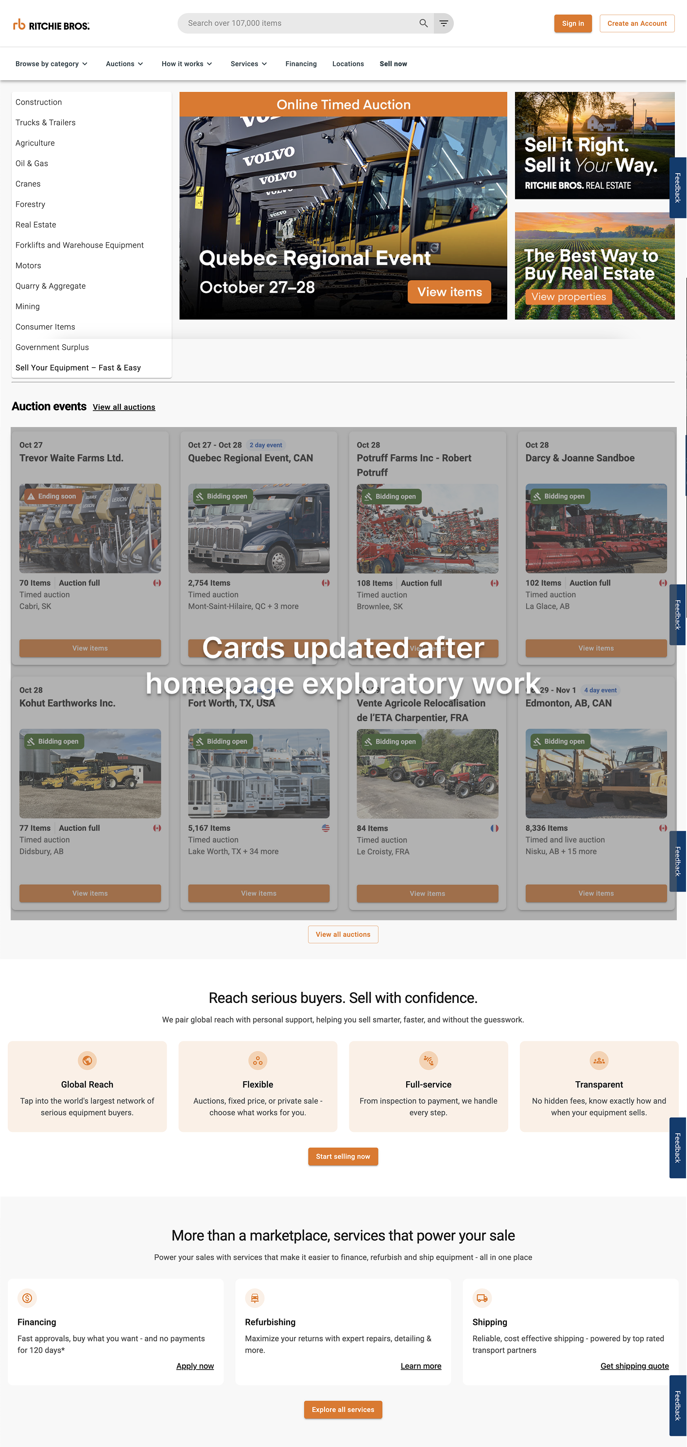 The existing homepage, was functional, but basic. Most users didn’t spend a lot of time exploring the content that was available below the fold, preferring to use the global navigation or the quick-access list of equipment industries to navigate to results lists that they felt were more relevant. In an effort to show a larger variety of content that was more relevant to users and promote certain services, the marketing team was using a third-party integration that let them feature certain events or services, but it was limited to three items at most and didn’t scale properly to mobile screens.